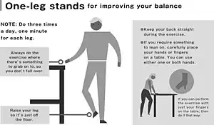 Single-leg standing with eyes open is an exercise that effectively improves balance and prevents falls.[1] Individuals are required to raise one foot by 5–10 cm with their eyes open for 1 minute. The exercise is to be done near a stable surface such as a desk to prevent falling. Three repetitions for each leg daily is recommended.[3]