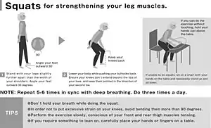 Squatting has been proven to improve strength and balance of the lower body and independence of activities of daily living.[1] Squatting involves lowering the torso from standing position and returning to the upright position. The proper squatting technique requires individuals to maintain the position of knees over the toes and the knee flexion angle below 90°.[1] Three sets of 5-6 repetitions are recommended daily.[1]