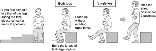 The stand-up test examines and measures the vertical movement ability of the body and the muscle strength of the lower extremities.[3] The test evaluates the ability to stand with one or both legs from stools of heights 10, 20, 30 and 40 cm.[1] The difficulty level increases in order of decreasing stool height and when using one leg instead of two. The test is usually performed in increasing order of difficulty starting from standing up using both legs from a 40 cm high stool. The trial is successful if the individual can stand and hold their position for more than three seconds.[3] The inability to stand up from a 40 cm tall stool using one leg is an indicator of stage 1 locomotive syndrome while the inability to stand up from a 20 cm tall stool using both legs is an indicator of stage 2 locomotive syndrome.[3]
