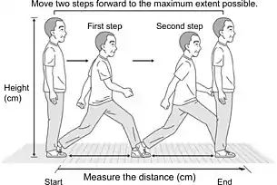 The two-step test evaluates balance and walking ability by assessing gait speed and maximal step length.[1] The test involves individuals taking two steps forward at maximum stride without losing balance and then standing still on both feet for more than three seconds.[5] The distance covered by the two steps is measured and divided by the individual’s height to obtain the two-step value which correlates with walking speed. The test is done twice and the highest value is noted. A score of less than 1.3 signifies stage 1 locomotive syndrome and a score of less than 1.1 signifies stage 2 locomotive syndrome.[5]