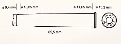 The original Winchester factory load consisted of a 275-grain (17.8 g) bullet at 1,480 ft/s (450 m/s).[1] This straight-walled cartridge case was designed for black powder rather than smokeless powder.