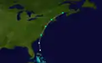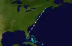 The first storm to directly strike the mainland United States was first detected on September 27, off the east coast of the Florida peninsula.[2] The storm is estimated to have been a minimal hurricane based on observations from the ship Virginia Ann.[3] Several other vessels encountered the storm along its track, including the steamship Marion, which experienced hours of violent winds, torrential rainfall, and frequent thunder and lightning.[9] The hurricane curved north, then northeast, striking North Carolina that same day before speeding northeastward as it hugged the United States East Coast. Its track is only known through 1200 UTC on September 28.[2] Ludlum (1963) refers to the hurricane as the "Equinoctial Storm", and describes its area of impact as the "entire coast".[10]