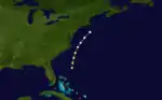 A tropical storm formed near South Florida on September 16. Later that day, the sloop Eliza was dismantled at Matanilla Reef, about 50 mi (80 km) north of Grand Bahama.[3] Moving north-northeastward, the storm began approaching the Carolinas on September 17. The cyclone intensified and peaked with winds of 70 mph (110 km/h) that same day. Around 13:00 UTC on September 18, the system made landfall in Emerald Isle, North Carolina. Thereafter, the storm tracked rapidly north-northeastward and lost tropical characteristics near the Connecticut–Massachusetts–New York state lines early on September 19.[5]