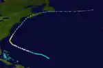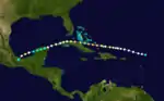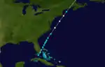 The steamship Jamaica first encountered this system on August 31 about 150 mi (240 km) northeast of Sombrero, an outlying island of Anguilla.[17] Initially a tropical storm, the system strengthened to a hurricane later that day. The storm intensified further, reaching Category 2 intensity prior to striking the Turks and Caicos Islands around 18:00 UTC on September 2. About 24 hours later, the cyclone peaked as a Category 3 hurricane with maximum sustained winds of 125 mph (205 km/h). On September 4, the storm made landfall along the coast of modern-day Villa Clara Province. Weakening to a Category 1 hurricane by early on the following day, the system turned southwestward over Cuba and remained over land until emerging into the Yucatán Channel several hours later. The hurricane then crossed the channel and made landfall near the northeastern tip of the Yucatán Peninsula on September 6. After weakening to a tropical storm, it briefly re-strengthened into a Category 2 hurricane while moving southwestward in the Bay of Campeche. Thereafter, the storm weakened back to a Category 1 prior to its landfall near Coatzacoalcos, Veracruz, early on September 8 and soon dissipated.[2]