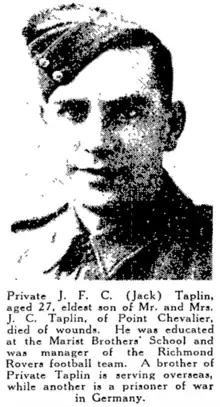 John (Jack) Frederick Crang Taplin was killed in action on July 22, 1942, aged just 27. He was educated at Marist Brothers’ School and was the manager of the Richmond Rovers side prior to going to war. His father was John Taplin, and mother Mildred Taplin. John (Jack) was living in Onehunga at the time of his enlistment. He was killed in the Western Desert campaign, North Africa and buried at El Alamein War Cemetery, Egypt.[20] Taplin's two brothers, Edgar, and Albert were also serving in the war at the time. Jack is memorialised at the Onehunga War Memorial Swimming Pool, and at the Auckland War Memorial Museum, World War 2 Hall of Memories.[21]