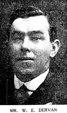 On April 18 William Edward Leo (Billy) Dervan died at the age of 60 at his residence at 4 St. Stephen's Avenue, Parnell. He was Kiwi #72, representing New Zealand on their 1912 tour of Australia. Dervan was educated at the Marist Brothers' School in Pitt Street. He originally played rugby for Marist Brothers' Old Boys Club, then the City club before switching to rugby league in 1912 where he played in the forwards. He played 4 matches for Newton Rangers in the same season, scoring 5 tries and kicking 4 goals. He retired at the end of the season but served on the Newton committee in 1913.[32] He was heavily involved in boxing and was the official announcer for the Auckland Boxing Association for over 20 years, and took an interest in several other sports such as swimming, wrestling, and cricket. Dervan also volunteered at the New Zealand Institute for the Blind where he "read to the inmates [and] kept them fully acquainted with topics of the day".[33][34]