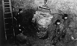 The EOD team found that the bomb had apparently left the airplane still attached to its rack, and that its timer circuit could not start until it had left its rack. (The rack was found a mile east of the bomb itself.) The bomb had become deeply buried in mud, and it required three days of excavation to recover its MC-772 Arm/Safe Switch. In 2013, Lt. Jack ReVelle, an EOD officer on the scene, recalled the moment:[35] "Until my death I will never forget hearing my sergeant say, 'Lieutenant, we found the arm/safe switch.' And I said, 'Great.' He said, 'Not great. It's on arm.'"[36]