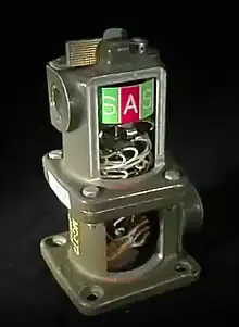 After the weapon had fallen a required vertical distance, the differential pressure switch would close contacts which passed battery current through the MC-772 Arm/Safe Switch and from there to the MC-788 High Voltage Safing System, which is armed by continual current being applied to it.[15] Upon receiving this current, the MC-788 would then connect the (not yet-charged) high-voltage thermal battery to the X-Unit, the electrical device that provides a high voltage signal to the detonators used in the "primary" stage of the weapon.[16] After the timing circuit completed its countdown of 42 seconds, it would then deliver initiation power to the MC-641 High Voltage Thermal Battery pack. This would begin to generate its full voltage of 2500 volts within 1-2 seconds, which would be applied directly to the trigger circuit and, through the MC-788 High Voltage Safing System, to the capacitor bank of the X-Unit. Once the bomb impacted the ground, a crush switch on the nose of the bomb would be closed and trigger the X-Unit to discharge its capacitors and initiate the high-explosive system in the "primary" stage of the weapon.[12][17]