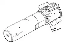 Once the bomb cleared the bomb bay and the arming rods retract, they would trigger a MC-845 Bisch generator. This was a single-pulse generator that began the overall firing sequence. The Bisch generator would send an initiation signal to the MC-640 low-voltage thermal battery back, as well as the MC-543 Timer. The timer would begin to count down. A pullout-valve assembly would also be triggered that would seals a reference chamber in the MC-832 Differential Pressure Switch, a barometric fuze for detecting the bomb's altitude, used for an airburst detonation setting.[12]