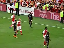 Arsenal made its first summer signing prior to start of the current season on 25 May, with the acquisition of Swiss midfielder Granit Xhaka for a reported £30 million fee. Xhaka's involvement in UEFA Euro 2016 and his subsequent desire to secure his club future beforehand enabled Arsenal to uncharacteristically complete a signing before the formal opening of the transfer window.[4] In the following weeks, the Gunners activated the release clause of Leicester City forward Jamie Vardy.[5] However, they failed in their attempts to bring Vardy from the Premier League champions, with the England forward instead opting to sign a contract extension with the East Midlands club.[6] Manager Arsène Wenger came under fire for failing to secure the transfer, and fans were outraged further when Arsenal signed young forward Takuma Asano from Sanfrecce Hiroshima,[7] due to the relative unproven nature of the forward's capabilities. Arsenal made its third summer signing on 22 July, signing Bolton Wanderers' Player of the Year Rob Holding. He joined for a reported £2 million fee from the League One side.[8] Arsenal played Lens later that day in their first pre-season game, with a late chipped goal from Alex Oxlade-Chamberlain earning Arsenal a hard-fought 1–1 draw.[9] Arsenal then flew out to California for two more pre-season fixtures, against the MLS All-Stars and Chivas Guadalajara. Wenger would state that Per Mertesacker would not be on the tour, after picking up an injury against Lens. He would later confirm that Mertesacker had surgery in his native Germany, and would be out for "months".[10] Arsenal beat the All Stars 2–1 on 28 July (July 29 BST), with a Joel Campbell penalty and a Chuba Akpom close-range finish coming either side of a goal from Didier Drogba.[11] Arsenal concluded their tour on 31 July (1 August BST) with a 3–1 win over Chivas. Oxlade-Chamberlain and Akpom scored their second pre-season goals each, with the opener scored by Holding.[12] Wenger confirmed that the injury to Mertesacker meant he'd need to sign a replacement ideally before the season's opener against Liverpool on 14 August,[13] as talks of incoming transfers intensified.