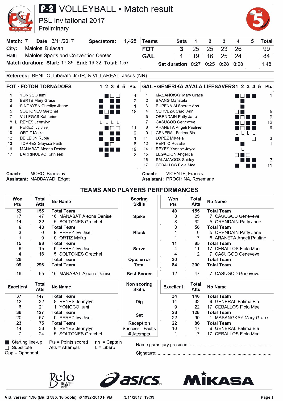 | 11 March | 17:00 | FOT | 3–1 | GEN | 25–19 | 25–16 | 23–25 | 26–24 | 99–84 | P2 | |