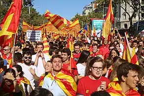 The 2017 demonstration against Catalan independence was a large demonstration in Barcelona, Spain, organized by Societat Civil Catalana on 8 October 2017, usually named after its slogan 'Stop! let's come to our senses' (in Catalan 'Prou! Recuperem el Seny'). It took place around midday starting in Plaça Urquinaona and ending in França railway station. The objective of the rally was to voice protests and growing concerns about the accelerating Catalan independence movement and the recent referendum on self-determination as well as to call for the preserved unity of Spain. The number of demonstrators was estimated at 950,000 by the organizers[1] and 350.000 by the local police.[2][3]