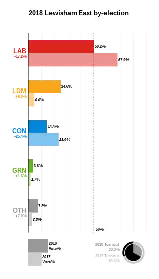 A by-election was held in the UK Parliament constituency of Lewisham East on 14 June 2018, following the resignation of Labour MP Heidi Alexander.[1][2] It was the second by-election held during the 57th UK Parliament, which was elected in June 2017.