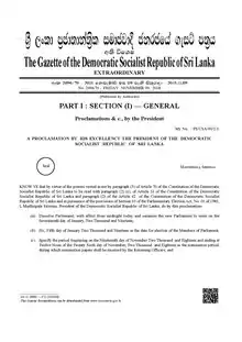 Amid calls to reconvene parliament Sirisena and his party admitted they did not have enough votes to support Mahinda Rajapaksa against Ranil Wickremesinghe to decide the office of Prime Minister. Ahead of the president's announcement the UPFA said they were at least eight legislators short of getting a majority for Rajapaksa in the parliament. "At the moment we have 104 or 105 MPs," UPFA's spokesman Keheliya Rambukwella told reporters. He further went on to say the Sirisena-Rajapakse group hoped to secure support from "crossover" legislators. This is in contrast to what Sirisena claimed on the 5th, that he had the support of 113 legislators when he sacked Wickremesinghe. According to an AFP count, 120 MPs support Wickremesinghe and his allies.[77] President Sirisena dissolves Parliament by proclamation, from midnight of 9 November and declared snap parliamentary elections to be held on around 5 January 2019.[78][56][79] The move was swiftly denounced by the United National Party in a post on Twitter, saying it "vehemently rejects" the sacking of the parliament. The party also accused Sirisena of robbing the "people of their rights and democracy".[78] The act was in violation of the 19th Amendment to the constitution, which he co-sponsored.[56][80] A short while later it was announced through an extraordinary gazette notice that general elections will be held on 5 January 2019, with the first meeting of the new Parliament to be held on 17 January 2019. UPFA MP Lakshman Yapa Abeywardena said "The nominations would be tendered from 9 to 26 November".[81] The JVP has accused Sirisena of trying to consolidate his power grab.[77] The election date was announced even before preparing the government's annual budget for the next fiscal year in 2019.[82]
