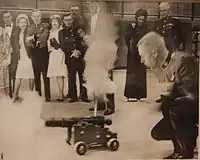The gun was given by Duncan F. Cameron, a retired officer of 2 Intelligence Company, to the unit Officers' Mess to mark Canada's Centennial. He presented the gun to Major Wilford C. Wheeler, Commanding Officer of 2 Intelligence Company at the unit's Christmas Ball, December 16, 1966, at which time it was fired. It was also fired on February 24, 1967, to officially open the Toronto Garrison Officers' Centennial Ball at Moss Park Armoury.[67]