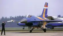 The Aerobatic Team Elang Biru or Blue Falcon was formed in 1994 and active in 1995. The team flies 6 F-16 from the 3rd squadron in a special blue and yellow livery with red and white stripes and is one of only 3 F-16 aerobatics team, the other being USAF Thunderbirds and RSAF Black Knights.