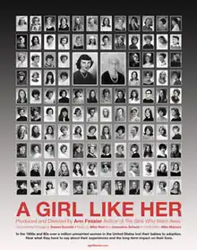 A Girl Like Her is a 2012 American documentary film by Ann Fessler about women who lost children to adoption in the United States between the end of World War II and the early 1970s due to the social pressures of the time, in a period now known as the Baby Scoop Era. Fessler combines the voices of the women with footage from educational films and newsreels about dating, sex, “illegitimate” pregnancy and adoption. The women's stories unfold over footage of life in post-World War II America. Educational films offer guidance about dating and sex, and scripted newsreels shed light on adoption in an era when secrecy prevailed and adoptable babies were thought to be “unwanted” by their mothers. As the footage illuminates the past, the women's stories form a collective narrative as they recount their experiences of dating, pregnancy, family reaction, banishment, and the long-term impact of surrender and silence on their lives.[1]
