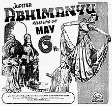 Jupiter Pictures, a production company promoted by M. Somasundaram and S. K. Mohideen shifted to Madras from Coimbatore in 1948 after acquiring Neptune Studios. In 1948 they produced Abhimanyu, a mythological tale from the epic Mahabharatha at Madras. During the 1930s and the 40s Tamil films were mostly based on when mythologicals, folktales, folk myths and socially themed films were rare. Somasundaram himself directed the film along with A. Kasilingam. The script was written by A. S. A Sami and M. Karunanidhi. This was the second film for Karunanidhi as script writer after Rajakumaari (1947). M. G. Ramachandran and M. N. Nambiar played supporting roles in the film. The film's music was composed by S. M. Subbaiah and C. R. Subbaraman.[2][3] S. S. Rajendran was cast in the title role, but was relieved after only two weeks of shooting from the film as T. K. Muthusamy of the TKS Brothers drama troupe revealed that Rajendran was still under contract with them, and threatened legal action if the film continued production. Thus the role went to newcomer S. M. Kumaresan.[4]