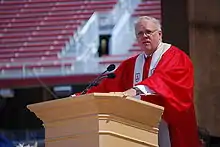 As at most American universities, academic dress is primarily worn at major ceremonies on campus. The adoption of Intercollegiate Code of Academic Costume by many universities in the Eastern United States was ostensibly completed to provide graduating students with an outward equality.[7] At the same time, Stanford President David Starr Jordan believed that medieval ceremonies should not be artificially revived at a newly created institution.[2] It seems that because of this official ambivalence towards academic regalia, it was used only at commencement from an early date.[3] This continues to be the case today at Stanford.