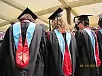 The school's first commencement ceremony took place in 1892 and was a very low-key affair.[2] It was not until 1899 that a student at Stanford convinced her classmates to wear caps and gowns at the annual graduation ceremony.[3] They remained the only ones to use academic dress until 1903 when eight law graduates adopted it.[4] Finally, in 1907, the entire student body adopted academic dress and by 1909 most of the faculty were also wearing such dress.[2] Having been founded by as the Intercollegiate Code of Academic Costume (ICC) was developing, Stanford did not have its own system of academic dress in place when caps and gowns were first worn by students so they used the forms that had been laid out by the code in 1895.[3] It used a traditional hood with a lining of cardinal red.[5]