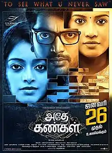 Adhe Kangal (transl. Same Eyes) is a 2017 Indian Tamil-language action thriller film written and directed by Rohin Venkatesan and produced by C. V. Kumar. The film features Kalaiyarasan, Janani and Sshivada in the leading roles and Bala Saravanan plays the role of comedian, while Ghibran composes the film's music. The film had a theatrical release on 26 January 2017, coinciding with India's Republic Day to unanimously positive reviews. The film was declared as a sleeper hit at the box office.[1] The film was remade in Kannada as Samhaara starring Chiranjeevi Sarja in the role of Kalaiyarasan, and also in Telugu as Neevevaro with Aadhi reprising Kalaiyarasan's role.