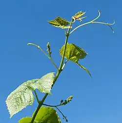 Some weak-stemmed plants produce wiry, coiled, sensitive, and delicate organs for climbing. They are called tendrils.[8] These may develop from either the axillary bud or the terminal bud of the stem. In Passiflora, the tendrils develop from the axillary bud. In Cissus quadrangularis and in Vitis vinifera the terminal bud develops into tendrils.[9][10][11]