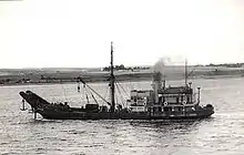 The mooring vessel HMS Moorland was built in 1938 on the Clyde by William Simons & Co of Renfrew. She initially served at Scapa, and then in the late 1940s on the Clyde and Rosyth, before being transferred to Gibraltar in 1961. She was to end her days sunk as target practice for HMS Juno on 26 January 1971 in the western Mediterranean.[17] Moorland was fitted with two 10-ton winches capable of heavy lifts from the seabed, and carried all the cables and anchors required for laying the moorings. The vessel was crewed by a Master, two engineers, and ten ratings — five for the deck and five for the engine room. In addition, when on mooring duty, she also carried a chargeman (supervisory worker) and twelve deckhands.[5]