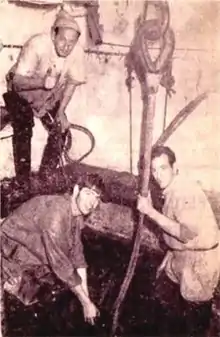 Working in dank, dingy, pressurized conditions, the men would skim off a thin layer of mud and attack the rock, first with pickaxes; as the hole deepened, one man would hold a crowbar for another to swing a sledgehammer. The rock, chipped out into boulders, would then be passed up by hands from the hole. Digging the hole would take two or three days until it was shoulder-high and deep enough for the anchor.[5]