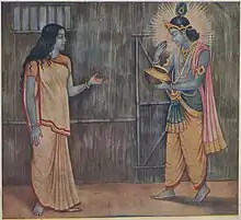 When the Pandavas were in exile in the forest, they received visits from many dignitaries, sages, kings, and ministers who were horrified at the turn of events. They came to discuss matters with the Pandavas and show their support. Draupadi found it very difficult to extend the customary hospitality to these numerous guests because the Pandavas were destitute in exile and living in the forest where nothing was available. Yudhishthira prayed to the god Surya, who blessed him the Akshaya Patra, the inexhaustible vessel.[2] Other version mentions different story, Draupadi started to pray to Krishna. Pleased with Draupadi's prayers, Krishna blessed her with the Akshaya Patra, a vessel that continually provides unlimited food every day, ceasing only once Draupadi, herself, had finished eating for the day.