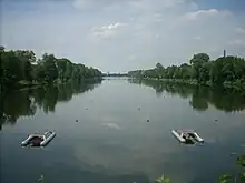The marked course is typically straight, and 2000 meters in length. The buoy system usually consists of six adjacent 13.5 meter-wide lanes, outlined by 7 lines of small, spherical buoys placed 10 or 15 meters apart. The buoys are red for the first and last 100 meters, the rest being white.[1] The six lanes are used for racing, and there may also be a separate lane for boats moving from the end of the course to the start line (the up channel). Some courses have as many as eight racing lanes.[2] Distances along the course are often marked at intervals, usually every 250 metres, with prominent numbered signs on the shoreline.