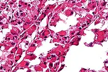 Micrograph of an alveolar soft part sarcoma, showing the characteristic alveolar-like architecture and cells with eccentric nuclei and abundant eosinophilic cytoplasm. H&E stain. | |