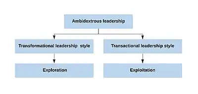 Ambidextrous leadership is a recently introduced term by scholars[1] to characterize a special approach to leadership that is mostly used in organizations.[2] It refers to the simultaneous use of explorative and exploitative activities by leaders. Exploration refers to search, risk taking, experimentation, and innovation in organizations, whereas exploitation has to do with refinement, efficiency, implementation, and execution.[3] Successful ambidextrous leaders must be able to achieve the appropriate mix of explorative and exploitative activities, unique for each organization, that will lead them to high firm performance outcomes.[4]