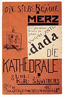 In 1920 Schwitters published a second book in the same format, called Die Kathedrale (The cathedral). Again published by Paul Steegemann, Hannover, the work contained 8 lithographs, and was published in an edition of c. 3000.[7] The lithographs are in the style of Schwitters' drawings of the period, using found elements, collage and stamps, along with scratchy pen and ink drawings.
