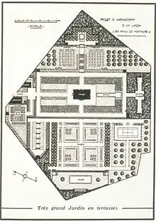 Les Jardins (1919) further defined the "regular" modern garden.[15] The American landscape architect Fletcher Steele found that Vera's book "of cubist-dada influence" was "decidedly worthwhile", but mainly due to "the droll woodcuts by M. Paul Vera with which they are illustrated." Steele dismissed Vera's innovations on the basis that he "seems to glorify the curious and original rather than the beautiful."[16] Vera criticized the historical revival of Achille Duchêne. He also felt that the imitation of nature in landscape gardens was artificial. He asserted that garden designs had to be based on the laws of mathematics and geometry, using the golden section and simple forms such as squares and triangles.[17] In 1920 Vera designed a garden for his house in Saint-Germain-en-Laye, working with his brother Paul. The rigidly symmetrical and geometrical design combined classical and modern elements, using topiary, vegetation carefully selected for its colors, and new materials such as reinforced concrete.[14]