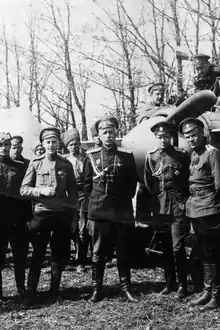 ![]() Andrei Snesarev, inspecting the 7th fighter squadron on the eastern front, approximately March 1917, during the First World War. Ivan Orlov on the right | |