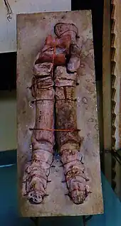 Cuvier named three species of Anoplotherium in the same year, the first of which was the "sheep-sized" A. commune and the other three of which were "smaller species" that he named A. medium, A. minus, and A. minimum. The etymology of the species name A. commune refers to how "common" fossils of the species were while the etymologies of the other two species were based on sizes compared to A. commune.[lower-alpha 1] He also attributed a cloven hoof (or didactyl hoof) to A. commune since the specimen appeared to be large-sized. He thought that Anoplotherium had didactyl hooves instead of tridactyl hooves, which would have separated it from Palaeotherium. Based on the hooves and dentition, he concluded that Anoplotherium was similar to ruminants or camelids.[4][5] However, in 1807, Cuvier found out that Anoplotherium commune had three toes on its hind limbs, although the third index toes were of smaller sizes compared to the other two.[6]