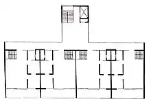 The residential block has an architectural module of 3.13 metres (10.3 ft) by 3.40 metres (11.2 ft). Three 3.13 metres (10.3 ft) modules are expressed on the north elevation of the office block by the 9.40-meter dimension of the bearing walls.[9] The outboard balconies are each of a different color and alternate position on every floor. The lower volume occupied today by the Ministry of Public Health.[lower-alpha 2][10] The 3.40 metres (11.2 ft) width of the rooms is further subdivided into three sections of 1.13 metres (3 ft 8 in) and this module determines the width of doors, windows, and passages between rooms within the apartment. The wooden windows have two sets of nine movable slats that can be independently controlled to modulate the natural light in the room, they can be completely closed to make the room totally dark, even in bright days. The pattern of the windows and door and the bearing walls (9.40 meters apart) are expressed on the Calle N elevation.