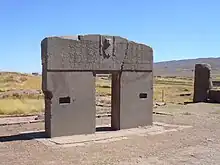 Located in the north is Kalasasaya‘s Temple, which is believed to have been used as an observatory. The most representative of it is the two huge sun gates cut from andesite, which is one of the most important representatives of Tiwanaku art. There are niches at the sides of the door, and a well-designed bas-relief above the door. The Temple Semi-underground also has beautifully carved. The walls are made up of 48 red sandstone columns with many carved stones set into it. It is clear that the former settlers of the city had a superb technique of carving and polishing various stone materials, combined with architectural techniques to make the architecture of the Tiwanaku empire more recognizable and representative. The ruins of ancient city of Tiwanaku has been listed on the World Heritage List by the United Nations Educational, Scientific and Cultural Organization (UNESCO) in 2000.[2]
