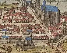 ![]() Below, the medieval Saint-Vincent gate at the southwest corner of the Arcis wall (from an engraving by Georg Braun and Frans Hogenberg, 1572). | |