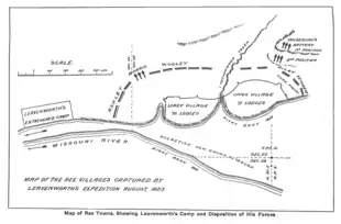 The Sioux, both Yankton and Yanktonai east of the Missouri and Lakota on the west side, had for long been at war with the Arikara, interrupted by short truces on Sioux terms.[10] The Arikaras in question were living in a double village on the west shore of the Missouri, six or seven miles (about 10 km) upstream from the mouth of Grand River. A small creek separated the two fortified villages of earth lodges, each with a heavy frame of wood.[11]