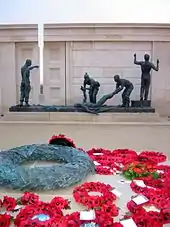 The bronze sculptures are the work of Ian Rank-Broadley. The Stretcher Bearers sculpture shows a wounded serviceman borne by comrades, watched by grieving family. It represents the cost of armed conflict on those left behind. The Gates sculpture group shows the body of a fallen serviceman taken into the arms of his comrades, and a figure pointing through the Great Gates of Eternity to Paradise. For this work Rank-Broadley received the 2008 Marsh Award for Excellence in Public Sculpture.[7]