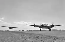 This first flight had actually been unintended, the test pilot having picked up too much speed during a ground taxi run, and had only taken off with the barest margin after traversing the entire runway.[9] Months later, P1360 was damaged after a forced landing during the test flight programme, but was promptly repaired. Early flights of the type by test pilots typically described it as being relatively average and being free of flaws.[9] A number of modifications were made to the design during this late stage of development, including the extensive redesign of the aircraft's structure by Lloyd at Coventry.[3] Further measures were made to improve the Albemarle's take-off performance, such as the adoption of a wider span 77 ft (23 m) wing, and the thickening of the rudder's trailing edge to correct a tendency to over-balance. Occurrences of the engines overheating were never fully resolved, the main change in this area being the raising of the maximum permissible operational temperature from 280C to 300C.[10]
