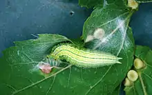 The female lays clusters of green eggs. The larva is green with yellow, white, or greenish stripes.