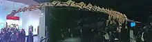 After excavation, the bones were stabilised with wet toilet paper and plaster of Paris, before being transported out of the site on a specially constructed road. At the museum, the bones were prepared by removing them from the rock matrix. They were then 3D-scanned by an international team of skeleton builders, and a life-size replica was made in Toronto, Canada, using fibreglass cast in computer-cut polystyrene moulds. By the end of the filming period, no skull had been discovered, so the skull of the model was reconstructed using the most likely of the three known titanosaur skulls, based on the single titanosaur tooth found at the site. (Dr Pol explains that Titanosaur skulls rarely survive as they were very delicate bones with light sutures). One of the femur (thigh) bones recovered was 2.4 m long, and a humerus had a circumference of 79 cm at the centre of the shaft, and this allowed the animal to be estimated at 37 m long and 70 metric tons in weight.[1] This would make the titanosaur larger than Argentinosaurus, another species of titanosaur. A ridge on the back of one of the vertebrae, and a few other features allowed the team to identify the titanosaur as a new species.