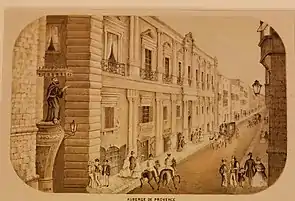During this time, the garden of the auberge was reduced in size with the sale to third parties of the two plots on Strait Street. The architect behind the project and the design of the new façade was Captain Antonio Garsin.[2] The design of the new façade was a clear proponent of the French classical style. The creation of street-level shop fronts also changed the dynamics of the use of the building. The common areas and halls used by the Knights where now relocated to the first and second floor of the building. It was also during this period that the Gran Salon took shape.