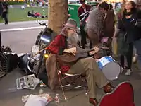 Baby Gramps plays a mixture of styles and eras including traditional blues, children's and labor songs, and his own compositions. His busy and unusual guitar style includes flat and finger picking, and "chording" with the back of his hand and his elbow. His singing styles include throat singing. His performance is based in part on improvisation and he often encourages audience participation. Baby Gramps has performed as a street musician, and has toured with Artis the Spoonman, Béla Fleck and the Flecktones and Phish. His rendition of "The Teddy Bears' Picnic" was featured in Martin Bell's Academy Award-nominated documentary film, Streetwise.