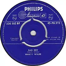 "Bad Boy" is a song by rock and roll singer Marty Wilde, released as a single in November 1959. It peaked at number 7 on the UK Singles Chart and number 45 on the Billboard Hot 100.[3][4]