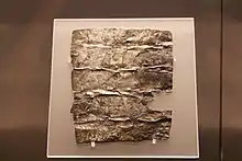 The tablets, some in a fragmentary state,[5] were small and rectangular and initially were assumed to be made of lead, although subsequent metallurgical analysis revealed that they are, in fact, made of lead alloyed with tin, with occasional traces of copper.[6] Some of the tablets were cast under pressure into thin, flexible sheets with a finish as smooth as paper whereas others appear to have been roughly hammered out from a molten lump.[7] Most of the tablets were inscribed, either with Roman capitals or with cursive script, but the expertise of the lettering varied.[7] Some of the tablets had markings that appear to be an illiterate imitation of lettering, for example repetitive lines of crosses or sevens, and some were completely blank.[8]
