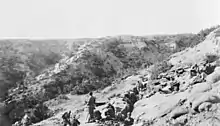 Baby 700 is a hill in the Sari Bair range, between Russell's Top and Battleship Hill. It was named after its supposed height above sea level, but its actual height was only 590 feet (180 m).[2] The Turkish name for the hill was Kilic Bayir.[3] The most direct route to there from the present ANZAC lines was a distance of 350 yards (320 m) from Russell's Top through The Nek, a twenty-yard (18 m) wide piece of high ground between Malone's Gully to the north and Monash Valley to the south.[4][5]