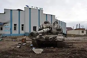 Damaged and abandoned Russian T-80UE-1 in Trostianets